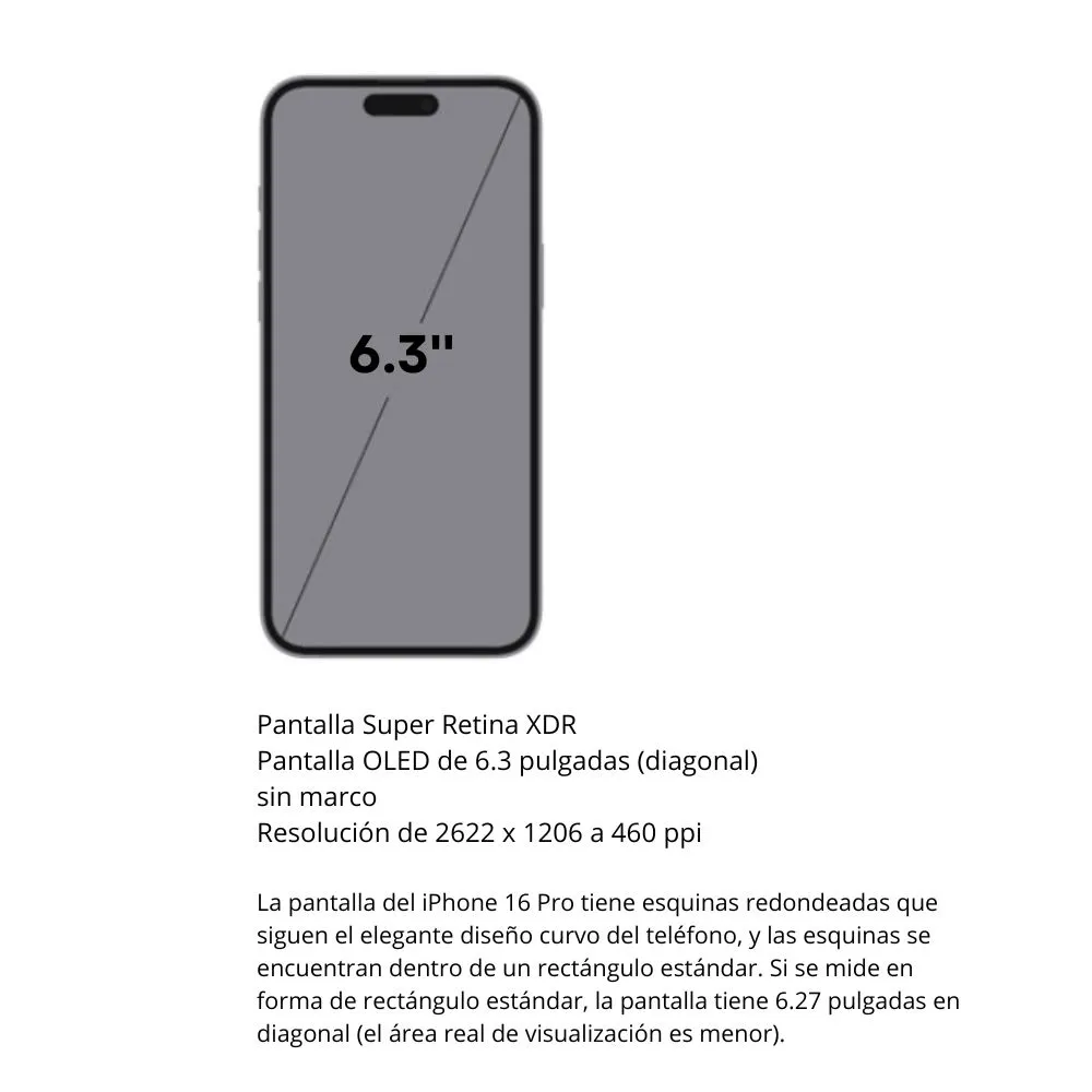 El iPhone 16 Pro lleva la tecnología móvil a otro nivel con su pantalla de 6.1 pulgadas Super Retina XDR ProMotion, que proporciona una fluidez inigualable con una tasa de refresco adaptativa de hasta 120 Hz. Potenciado por el chip A18 Pro Bionic, este dispositivo está preparado para las tareas más exigentes, desde la edición de videos en 4K hasta los juegos más avanzados. Su sistema de cámaras triple permite capturar imágenes profesionales con un nivel de detalle increíble, incluyendo un teleobjetivo mejorado para fotos de larga distancia. También cuenta con el Modo Cine, que permite grabar videos con enfoque selectivo en tiempo real. La batería ha sido optimizada para ofrecer un rendimiento prolongado, incluso con uso intensivo. El diseño de acero inoxidable y la resistencia al agua IP68 refuerzan su durabilidad, haciendo del iPhone 16 Pro una opción premium para los usuarios más exigentes.